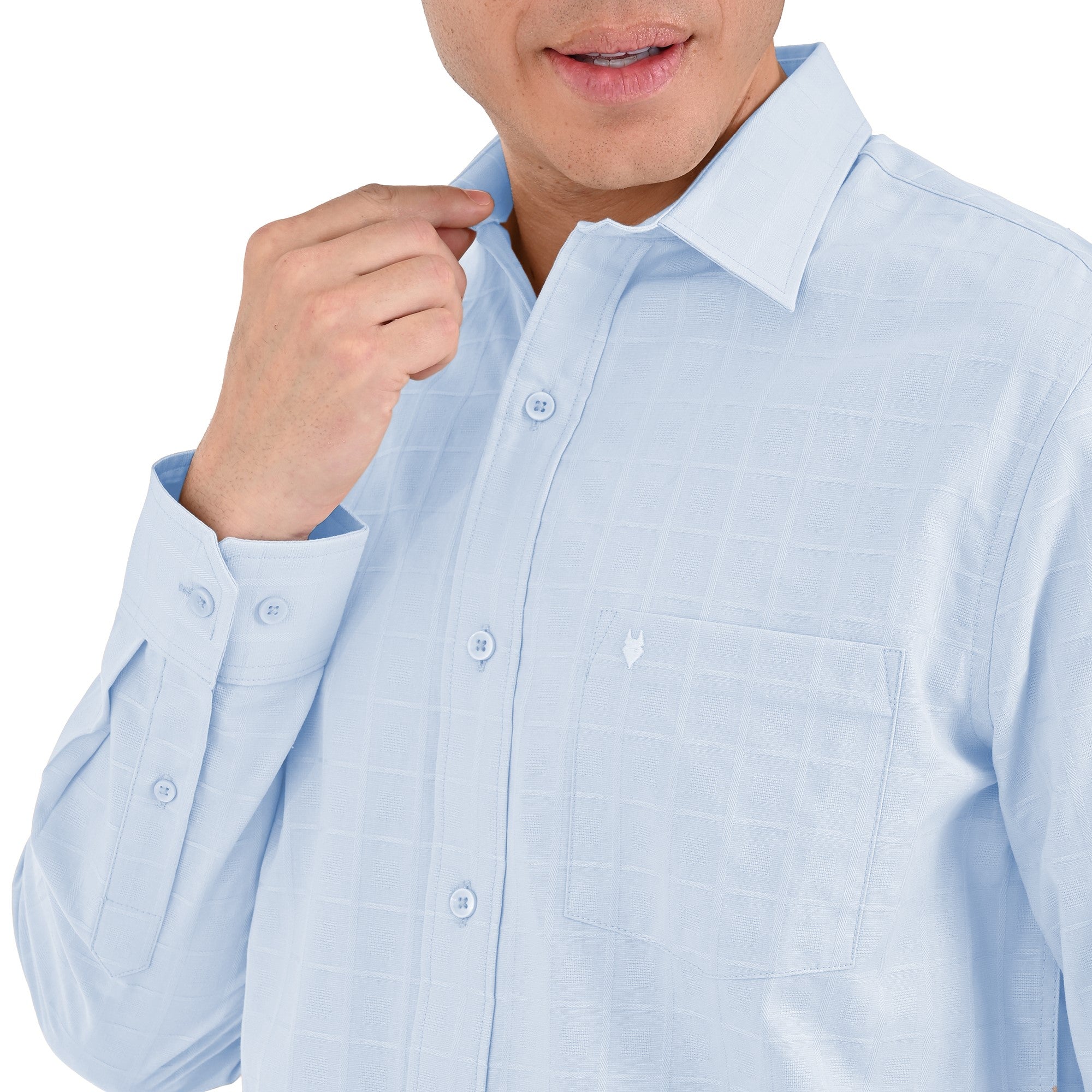 El diseño presenta un discreto patrón de cuadros en un clásico color azul cielo, blanco y beige con líneas finas blancas, lo que le da un toque de sofisticación. Con un cuello clásico, puños con botones y una caída impecable, esta camisa es la opción perfecta para combinar con un traje o un pantalón de vestir.